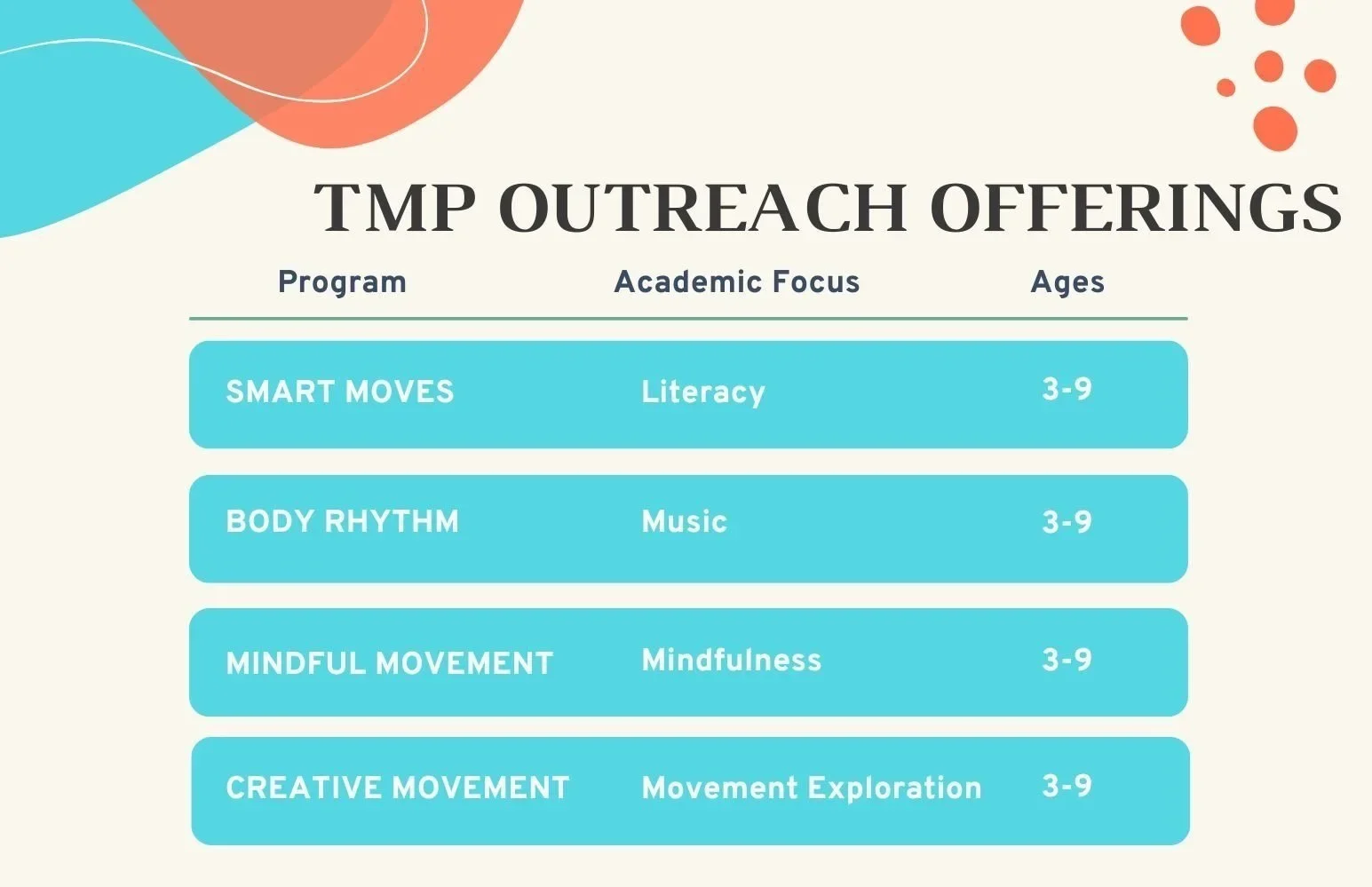 Since 2009, The Movement Project has provided high-quality, affordable dance education through outreach programs in schools, libraries, hospitals, community centers, and museums across Northeast Ohio. Led by TMP’s professional dance educators, these programs support students from early childhood through adolescence by fostering creativity, confidence, and a strong sense of community, while building skills that translate to both academic success and everyday life.